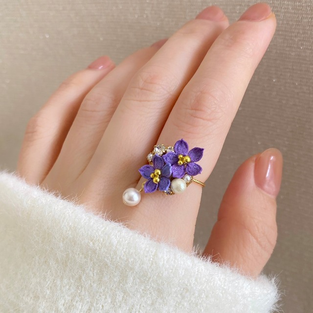 夜空に咲く星の花。 その花星が流星となり、静かに降りそそぐ─ そんな情景を思い浮かべながらかたどりました。 可愛らしい星形の花には、上品な艶感の硝子パールを合わせて…。星の桔梗とともに、どこかロマンチックなひとときを過ごしてみませんか。 《桔梗 - 花星咲く夜に Flower stars -》 ◇紫の桔梗の花言葉 「永遠の愛」「変わらぬ愛」「気品」「誠実」 ┈┈┈┈┈┈┈┈┈┈┈┈┈┈┈┈┈┈┈┈┈┈┈ 【サイズ】 お花部分 : 約 横1.6×縦1.8㎝(チャーム込み2.6㎝) リング金具 : フリーサイズ、調節可。 【素材】 綿 メッキ金属 ガラス 【リング金具】 メッキ金属 裏側レジンコーティング ※販売価格は一点あたりのお値段となります。