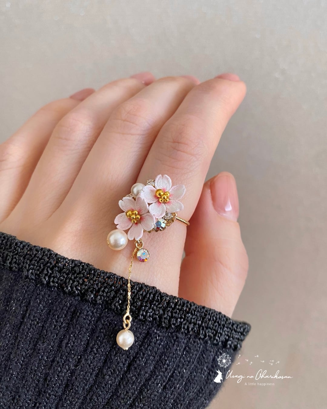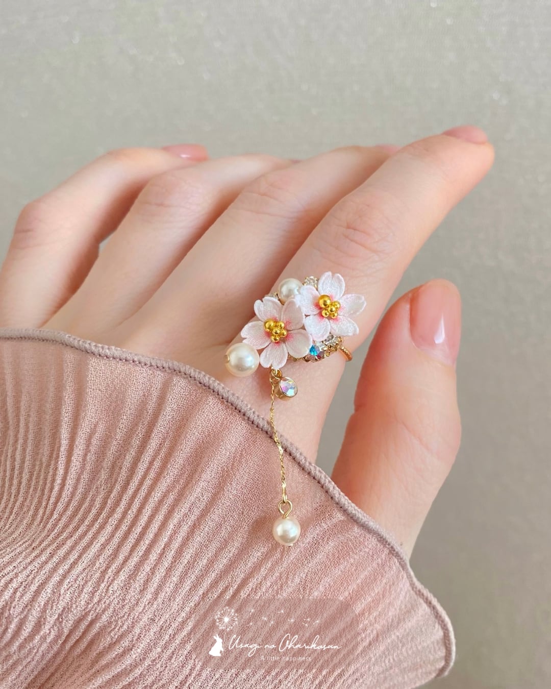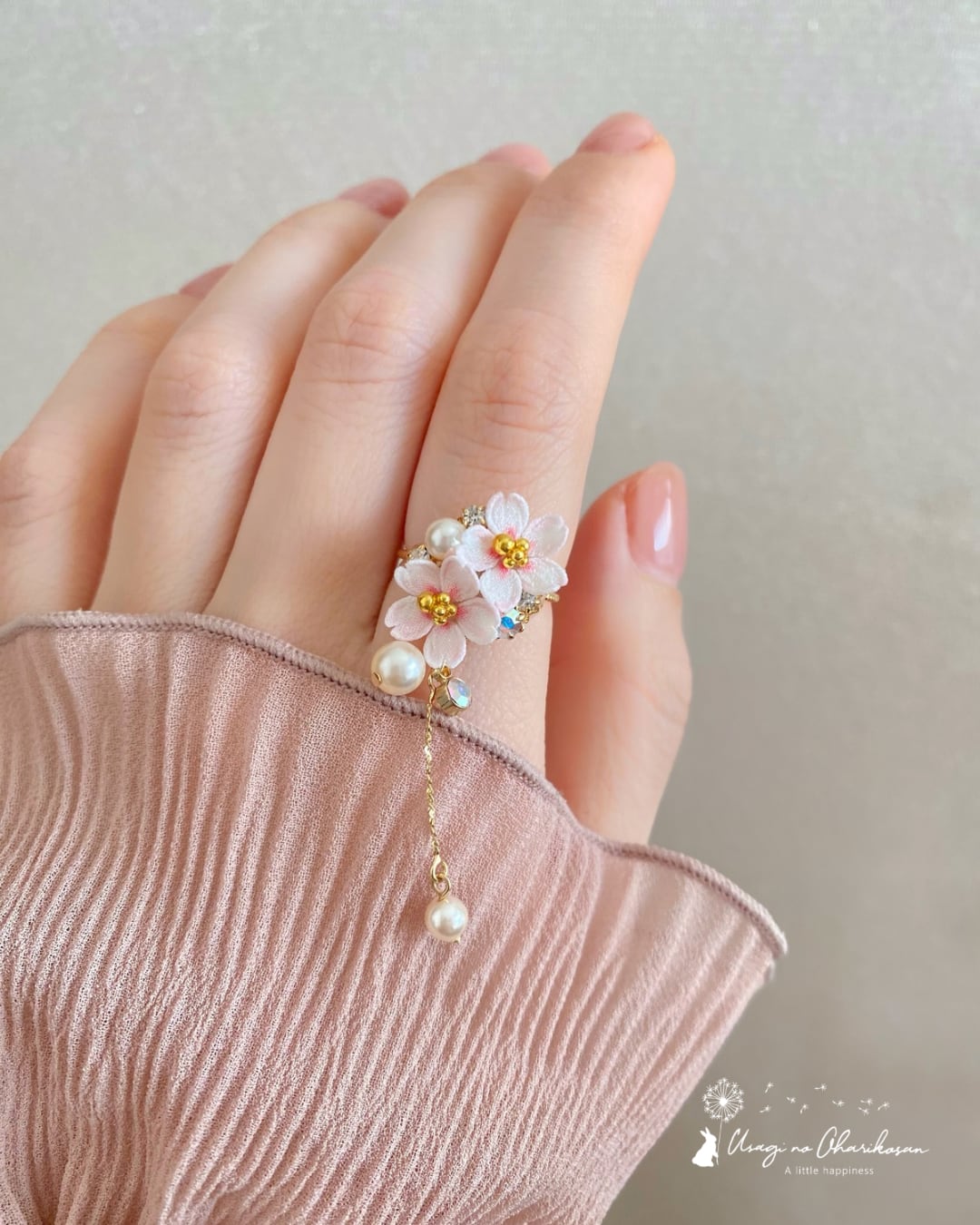 花盛りの桜に、ガラスパールを合わせて上品で穏やかな印象になりました。指先の動きに合わせて、パールがコロンと揺れてほんのり可愛らしい印象に。