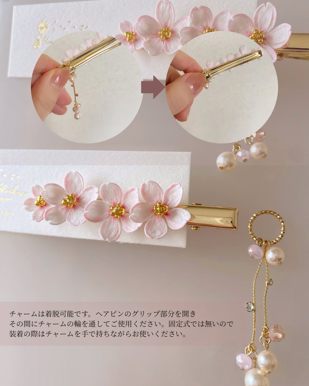 チャームは着脱可能です。(着脱の際にはヘアピンのグリップ部分を開きその間にチャームの輪を通してご使用ください。固定式では無いので装着の際はチャームを手で持ちながらお使いください)