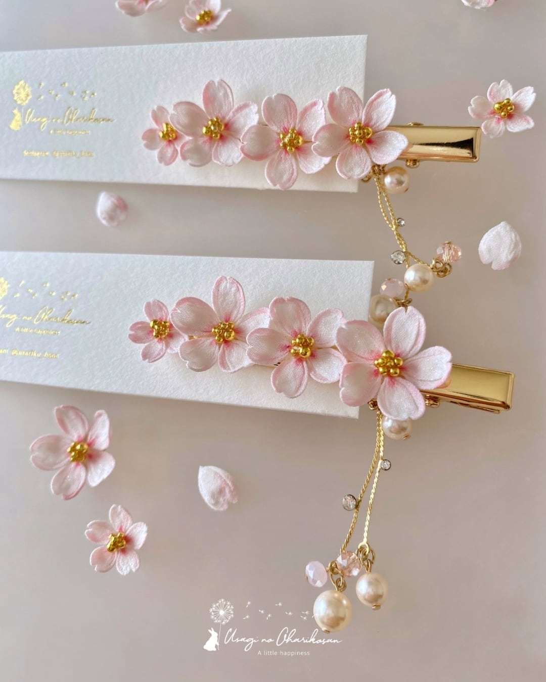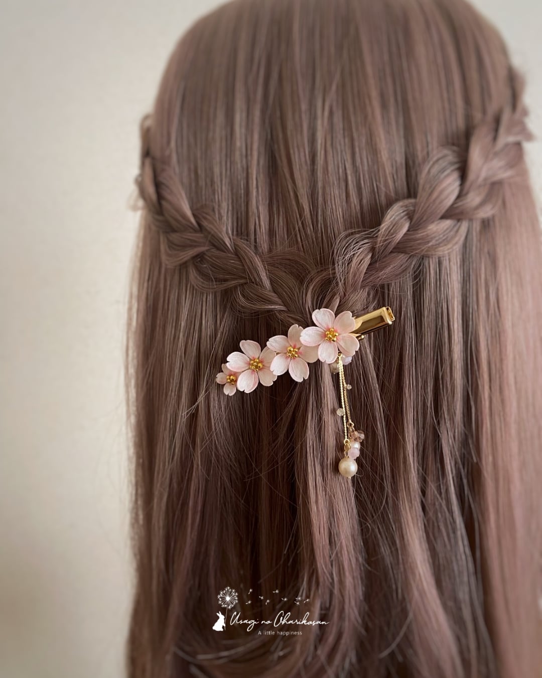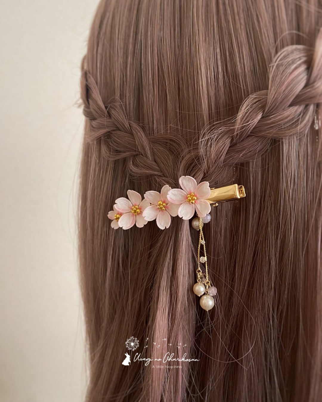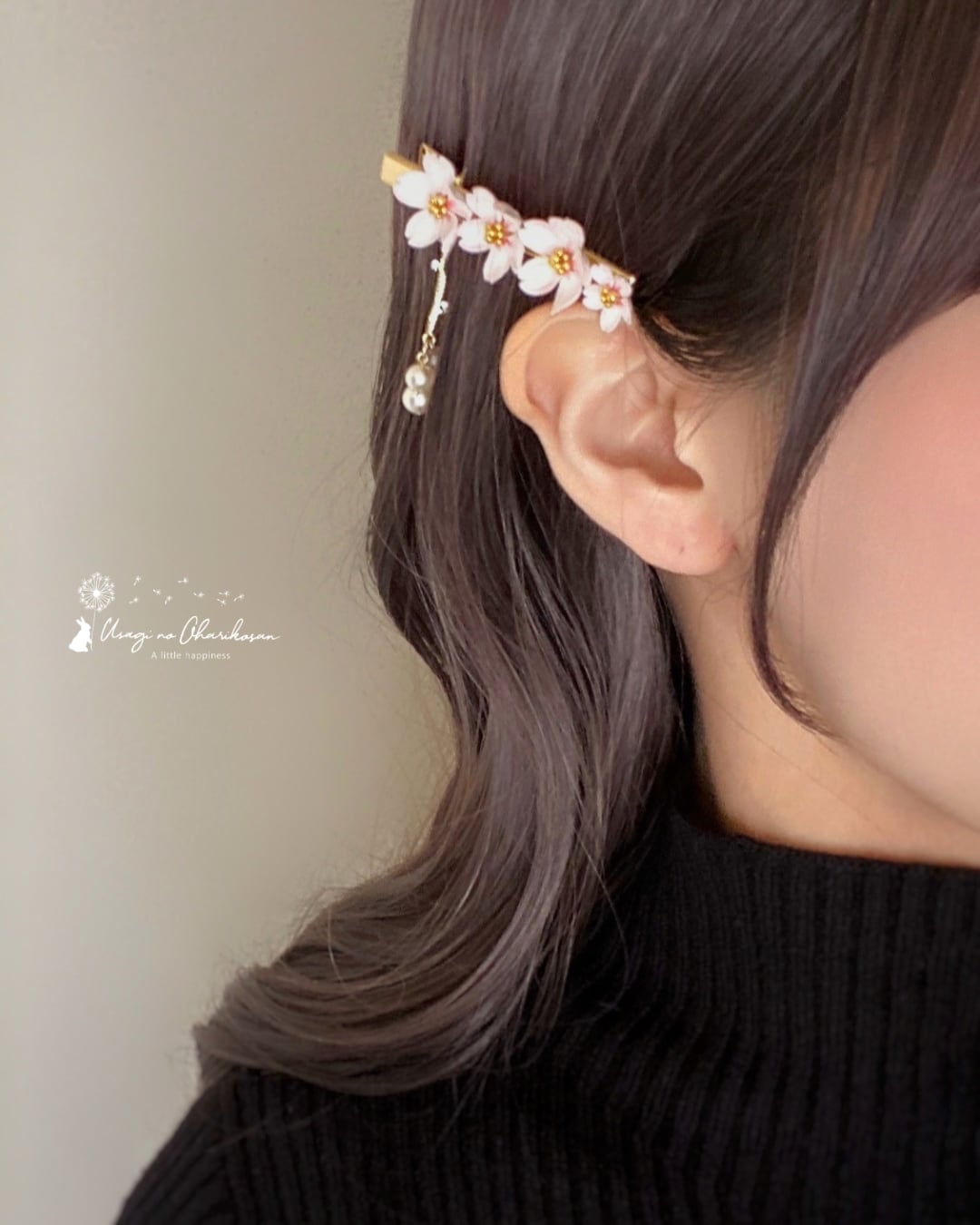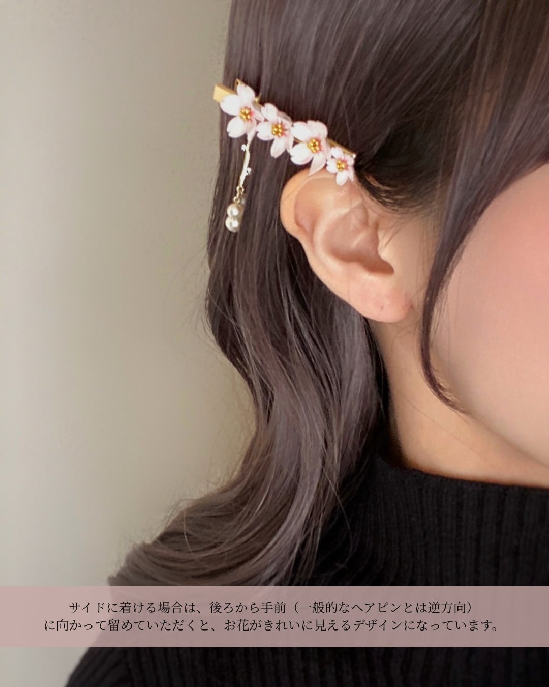 写真のようにサイドに着けても、(サイドにつける場合は普通のヘアピンと逆方向の後ろから手前に向かって着けると可愛いデザインになっております。)ハーフアップなどのヘアアレンジのゴム部分に上から着けても可愛く、色々な楽しみ方でお使いいただけます。